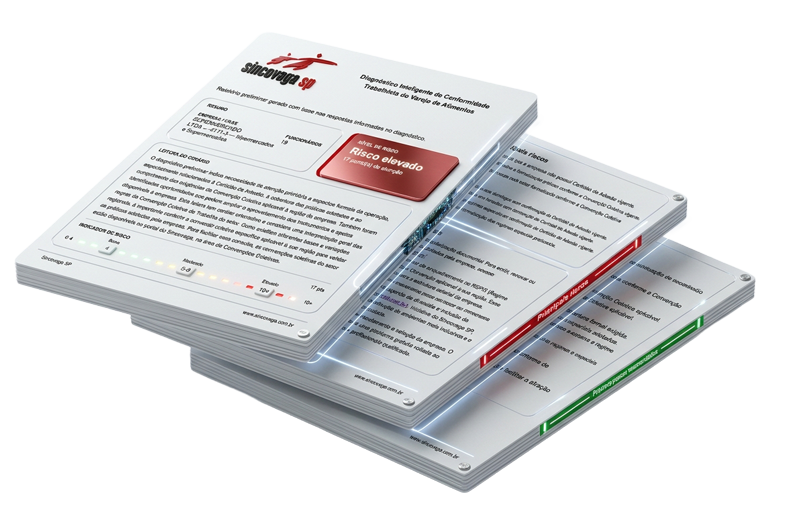 O Diagnóstico Inteligente de Conformidade Trabalhista do Sincovaga SP foi desenvolvido para ajudar empresas do comércio a identificar possíveis riscos relacionados à jornada de trabalho, obrigações sindicais, banco de horas, funcionamento aos domingos e feriados e exigências da Convenção Coletiva de Trabalho.